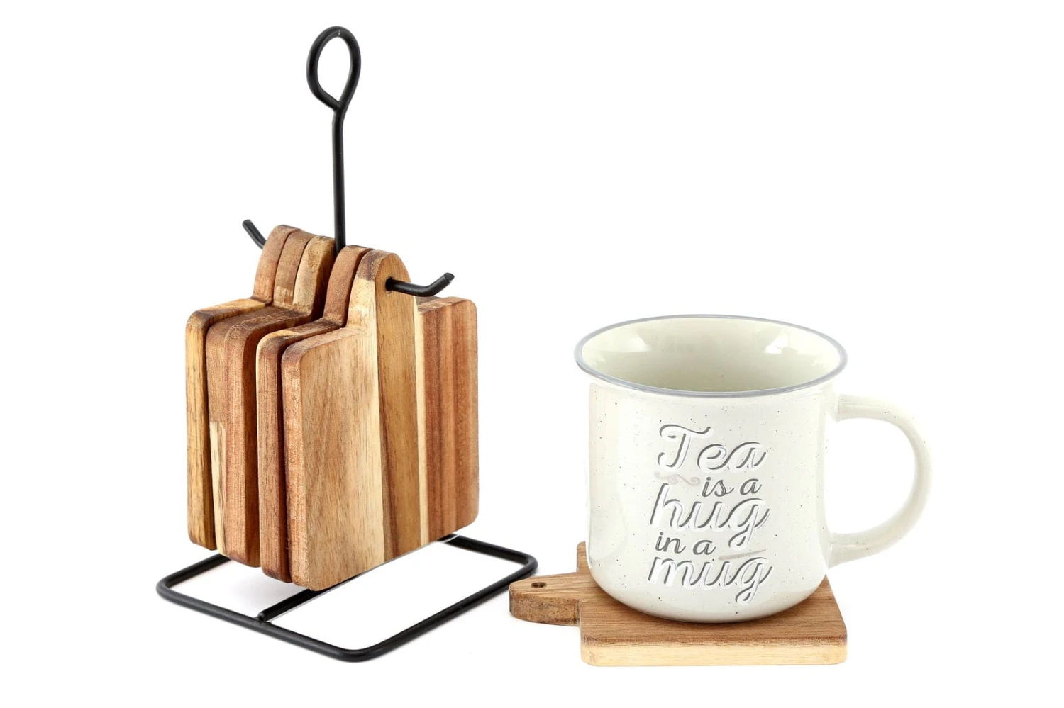 Acacia Coasters With A Black Metal Stand, Set Of 6