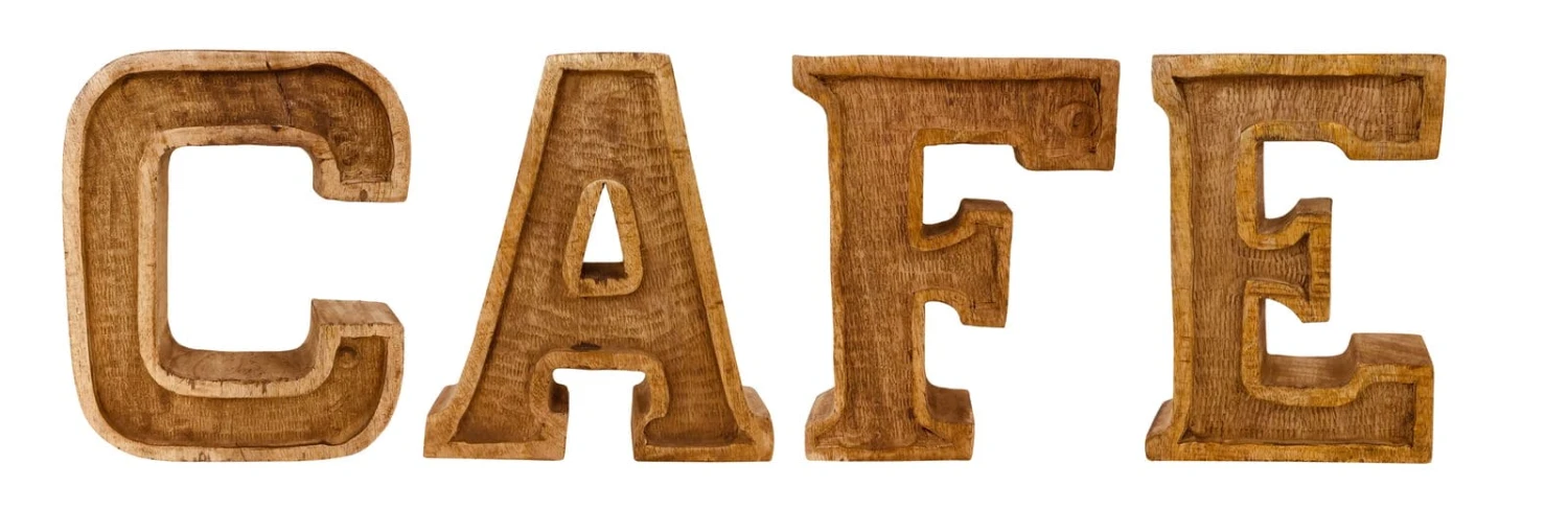 Solid hand carved mango wooden letters in the word of Cafe. The letters feature an intricate embossed design which is hand carved into the the letters. The letters have an overall rustic look and would fit perfectly into a variety of sceneries. The letters are free standing or can be wall mounted via the hanging brackets on the back. Perfect for new baby’s kid’s bedrooms, christening, engagement presents, wedding’s, birthday’s, and bars or cafes. Measurements: W67.5 x D4.5 x H21cm.Â